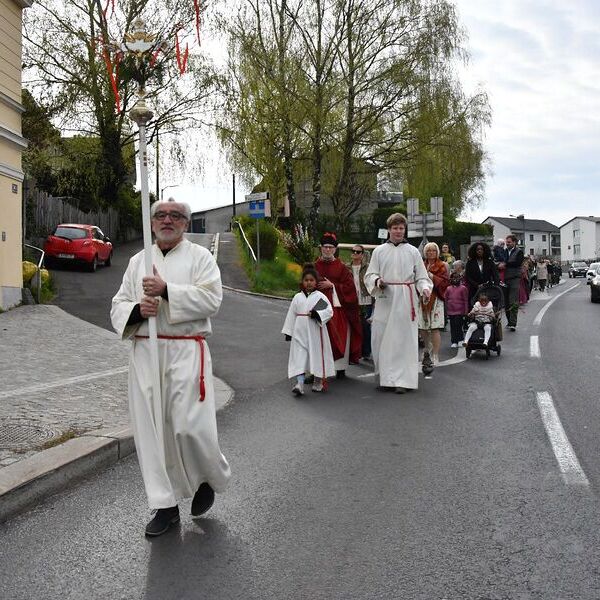 Die Auferstehungsfeier am Karsamstag begann am Kirchenplatz mit der Feuerweihe und dem Entzünden der Osterkerze. Das Osterfeuer entzündeten traditionell die Pfadfinder. Musikalisch wurde die Feier vom RhythmusChor gestaltet. Die im Gottesdienst geweihten Speisen wurden anschließend im Pfarrzentrum in geselliger Runde verzehrt.