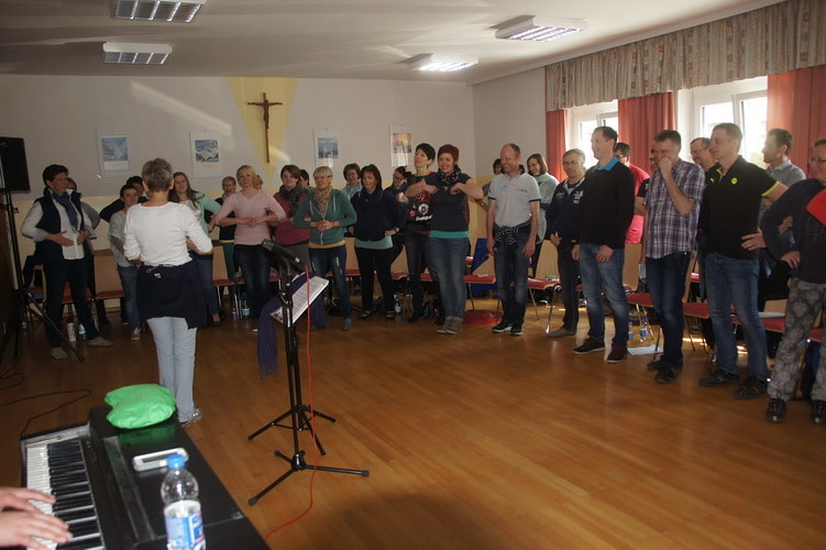 In humorvoller und professioneller Weise lernte uns Angelika Rehaag Schritt für Schritt die Gospelstücke ein – ohne Noten, denn so konnten wir noch viel freier singen. Von den verschiedensten Einsingübungen bis hin zu zahlreichen Singtechniken leitete sie uns durch das Wochenende und schaffte es, den gesamten Chor mit ihrer Energie anzustecken.