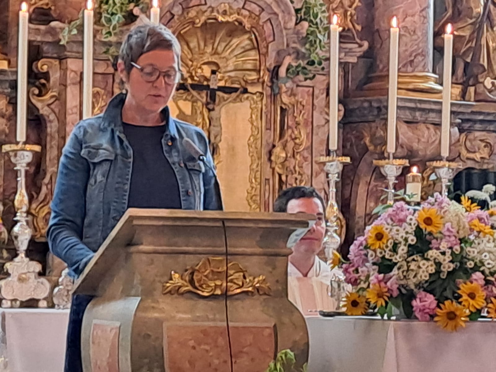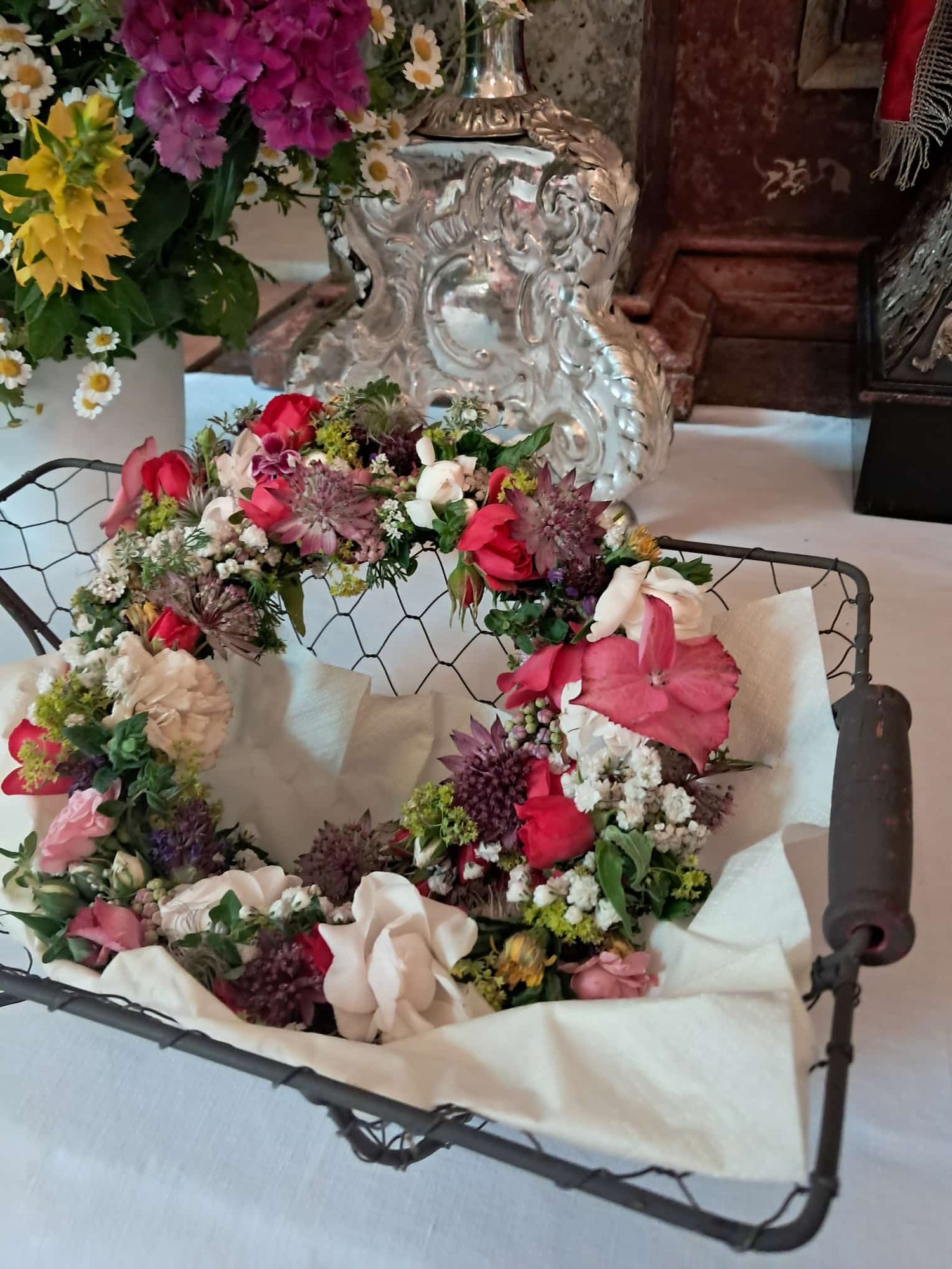 In den Tagen zuvor haben wir, die Frauen der KFB, Blumen und Kräuter gesammelt, die auf Feldern, Wiesen und in unseren Gärten wachsen – Zeichen der Fülle und der heilenden Kraft der Natur. In liebevoller Handarbeit und in guter Gemeinschaft wurden sie zu kleinen Sträußchen gebunden – bunt, duftend und voller Symbolkraft.