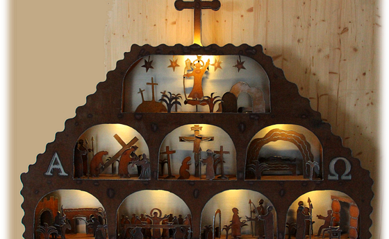 Die Krippe ist aus Altmetall hergestellt und zeigt in Silhouettenform die Passion vom Einzug in Jerusalem bis hin zur Auferstehung!